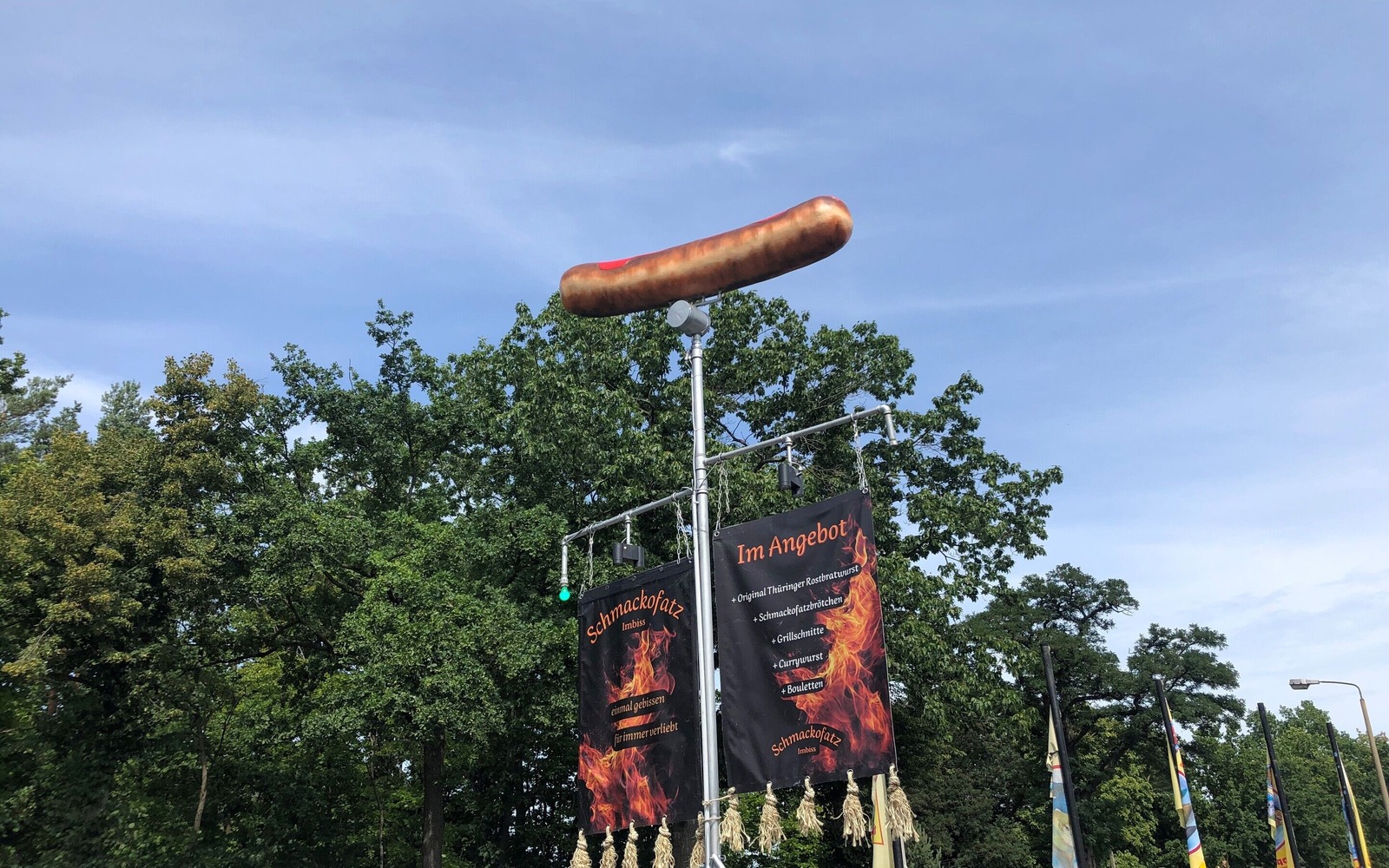 An der Dresdner Straße (B97) in Hoyerswerda erwartet hungrige Gäste ein ganz besonderer Imbiss. Schmackofatz, ist ein Grillstand mit außergewöhnlichem Wiedererkennungswert. Bereits von weitem sichtbar ist das imposante Markenzeichen des Imbisses – eine über zwei Meter lange, rotierende Thüringer Bratwurst auf einem sechs Meter hohen Sockel.