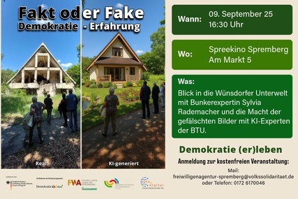 Was ist real, was erfunden, welche Fotos sind Fake, welche Fakt und was macht das mit unserer Welt? Antworten versucht die FreiwilligenAgentur Spremberg gemeinsam mit der Präsenzstelle der Hochschulen Brandenburgs Spremberg in ihrer Fortsetzungsveranstaltung "Demokratie (er)leben" am 9. September im Spreekino. Bereits im Mai führte eine Exkursion zu den gewaltigen Bunkeranlagen in Wünsdorf, gut eine Autostunde von Spremberg entfernt. In der Folgeveranstaltung lassen kurze Filmsequenzen die beeindruckende Welt unter der Erde auf der Kinoleinwand auferstehen. Dazu gibt es Informationen der Bunkerexpertin Sylvia Rademacher, Geschäftsführerin der Bücherstadt-Tourismus GmbH. Für Überraschungsmomente sorgen KI-generierte Fotos, die zeigen, wie leicht unsere Realität verfälscht werden kann. Ob Alltag oder Politik – Fakenews stellen sogar Wahlen auf den Kopf und können das friedliche Zusammenleben gefährden.