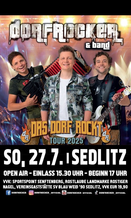 Die Besucher können sich an allen drei Tagen auf zahlreiche Veranstaltungshighlights für die ganze Familie freuen. Der Fußball steht hier im Vordergrund.Am Freitag gibt’s ein Duell der Traditionsmannschaft des 1. FC Lok Leipzig gegen die Alten Herren aus Sedlitz um 18:00 Uhr. Am Samstag stehen sich nach dem Nachwuchsturnier (ab 10:00 Uhr) die Frauen-Regionalliga-Teams von Hannover 96 und Türkiyemspor Berlin gegenüber. Los geht’s um 17 Uhr. Die erste Männermannschaft der Sedlitzer Gastgeber trifft am Sonntag um 13:30 Uhr auf die Ü 35 des FC Energie Cottbus.Auch Musikalisch wird es bunt. Die "Dorfocker" spielen am Sonntag ab 17 Uhr. "Wer sich die Tickets für das Konzert der Kultband im Vorverkauf sichert, hat dazu sogar noch freien Eintritt zum Cottbus-Spiel" Darüber hinaus gibt’s am Freitag eine Dorfdisco und am Samstag eine große Abendparty.