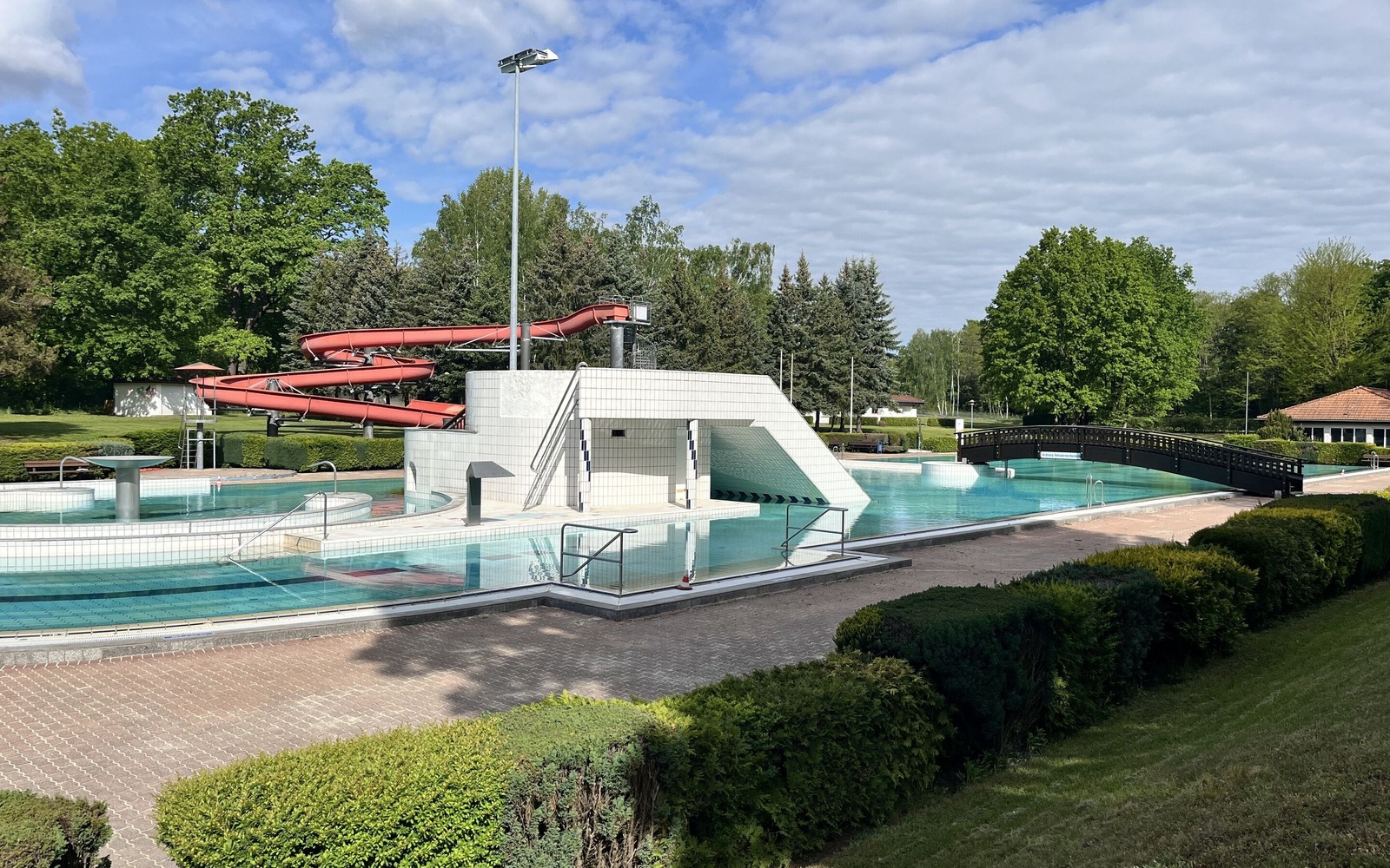 Das Freischwimmbad ist idyllisch im Waldgebiet am Rande von Spremberg/Grodk gelegen. Es verfügt über einen Erlebnis- und Schwimmbereich sowie über einen separaten Bereich für Familien mit kleinen Kindern. Der Erlebnis- und Schwimmbereich bietet vier 25-Meter-Schwimmbahnen, eine 72 Meter lange und 12 Meter hohe Rutsche, einen Strömungskanal, Wasserkanonen, einen Wasserpilz, eine Schwalldusche, Sprudelliegen und eine Grotte mit Sprudelplatte. Im Kleinkindbereich finden Gäste eine kreativ gestaltete Wasserfläche mit einer Wassertiefe bis 60 Zentimeter, einen Wasserspeier, Wasserpilze und Wasserfontänen.
