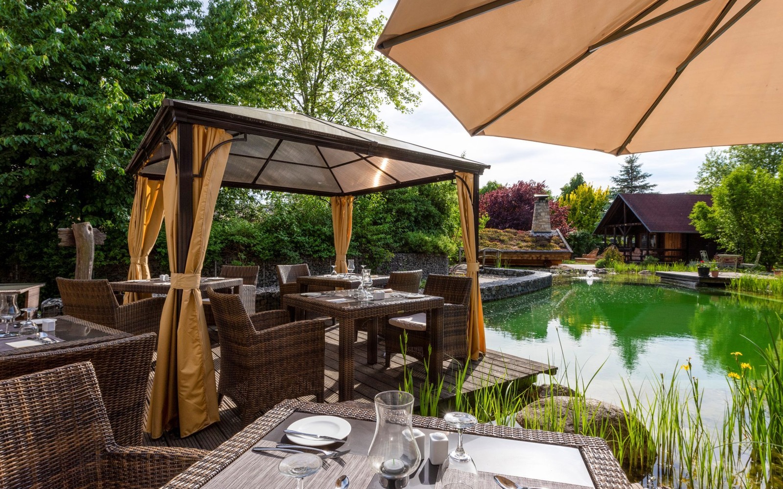 Ein idyllischer Wellnessgarten mit verschlungenen Wegen, Quellen, Brücken und Teichen integriert sich in das weitläufige SPA. Entdecken Sie versteckt im Grünen das duftende Brotstübchen, ein türkisches Hamam oder das urige Kräuterstübchen nahe der kaminbefeuerten Erdsauna.