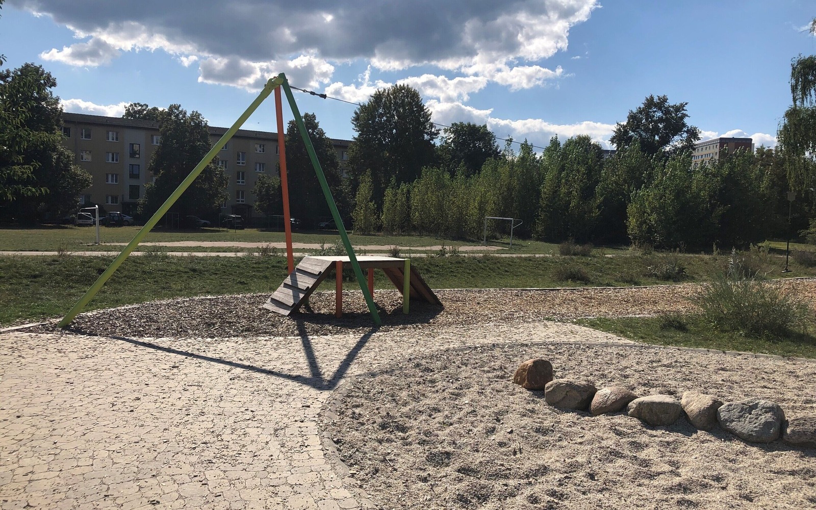 There is also a cable car with a wooden launch ramp. The entire area is accessible via paved paths, and seating and trash cans are provided. The playground is surrounded by trees and shrubs, which provide shade and a pleasant environment on hot days.
