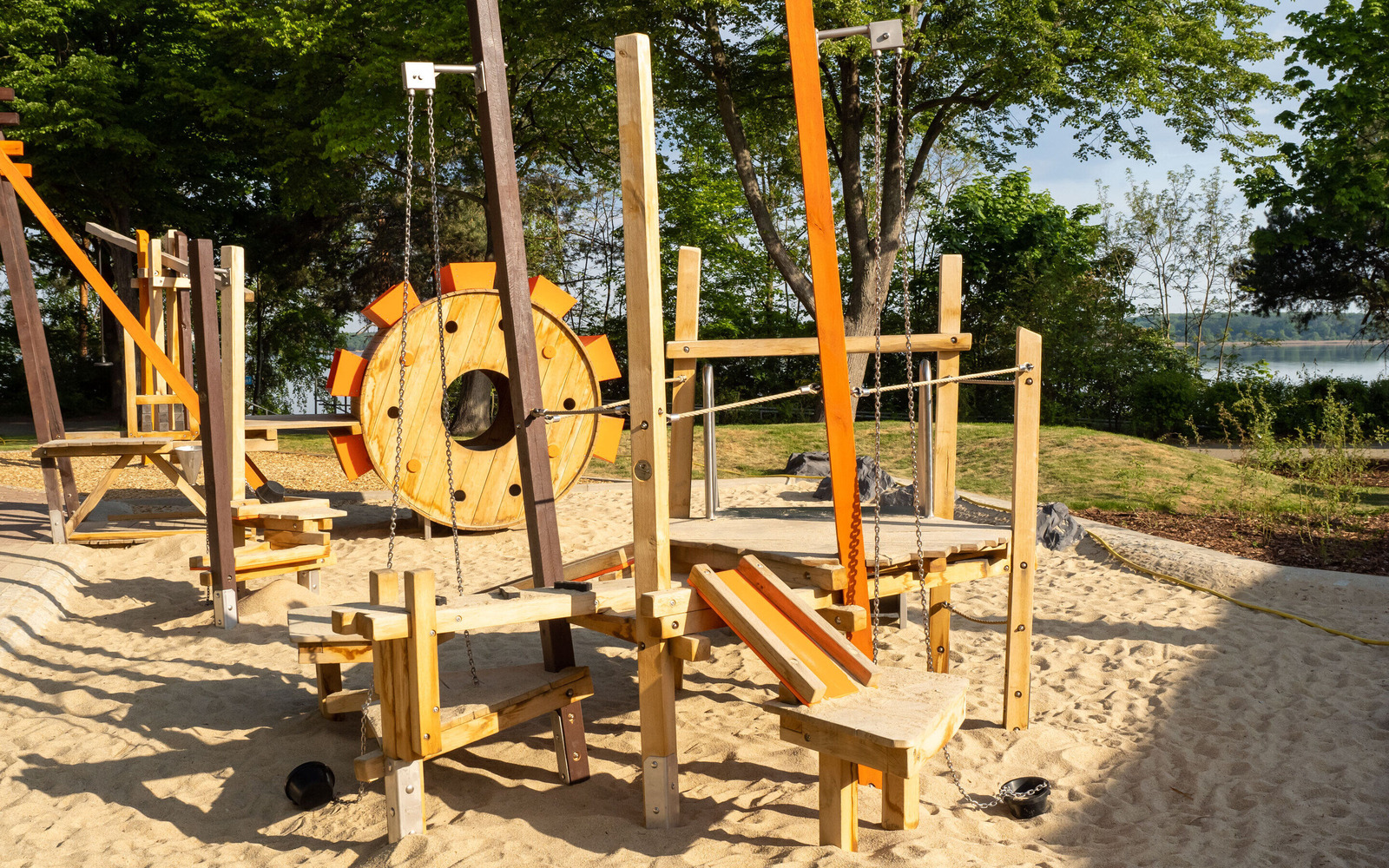 The newly designed playground at the Großkoschen lakeside beach is an exciting place where children up to the age of 12 can discover the mining history of Lusatia through play. Under the motto ‘Miner’, the facility incorporates key elements of former open-cast lignite mining in Lusatia. The highlight is a large bucket wheel excavator that can be climbed on. The offer is complemented by a conveyor ramp with a digging station, a wobbly coal slab bridge and a slide that recreates the removal of the coal. The design of the site is also reminiscent of open-cast mining: mounds in brown symbolise spoil heaps. The playground brings the structural change in the region to life in a child-friendly way.