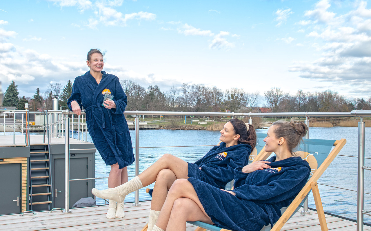Winterzeit ist definitiv Wellnesszeit und jede, die für ihr Leben gerne schwitzt, ist hier richtig gut aufgehoben. Am Senftenberger See können Frauengruppen ein Saunafloß exklusiv mieten und entspannte Stunden verbringen. Die Boote vom Anbieter treibHaus tragen eine geräumige finnische Sauna mit Panoramafenster, Lounge mit Soundanlage und Dachterrasse. Im Sommer können die Gäste damit in Eigenregie über den See kreuzen, im Winter liegen die Flöße im Hafen vor Anker. Bis zu zwölf Genießerinnen finden hier Platz. Snacks, Fruchtcocktails und Peelings mit Salz oder Olivenöl sind zubuchbar.