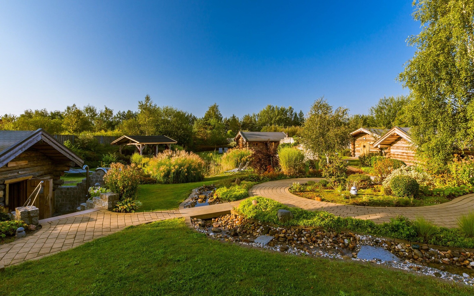 Ein Highlight ist das traumhafte Saunadorf mit rustikalen Blockhäusern und integrierten finnischen Saunen. Naturliebhaber können am Gartenteich mit Bachlauf in harmonischer Atmosphäre zur Ruhe kommen und Energie schöpfen.